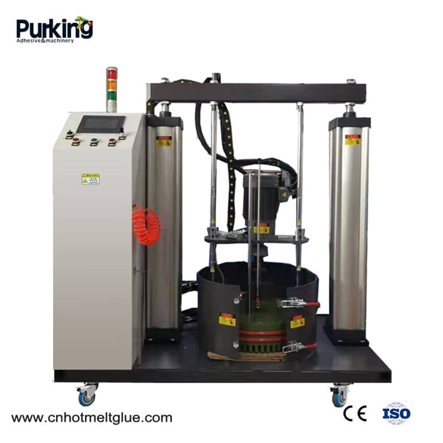 ჩვენი 55 gal PUR ნაყარი გამდნარი იღებს თანდათანობით გახურებას და დნობას: გათბობის ფირფიტა მდებარეობს წებოს ზემოთ. გათბობის ფირფიტის გაცხელებისას წებოს ლულის მხოლოდ ზედა ფენა უკავშირდება გამათბობელ ფირფიტს და დნობის წერტილს აღწევს და დნება. ამ დროს არ დნება წებოვანი ლულის ქვედა ნაწილი. დნობის მოთხოვნილების დასაკმაყოფილებლად, რამდენადაც ჩვენ წარმოებაში გვჭირდება, რეზინის ბარელში წებოს აქვს გრძელი სიცოცხლის ხანგრძლივობა: ქოთნის სიცოცხლე შეიძლება იყოს 16 საათამდე 150 ° C ტემპერატურაზე და 3 დღე 90 ° C ტემპერატურაზე. დიდი ხნის შემდეგ, კომპანიის პროდუქტებმა მომხმარებელთა დიდი მოწონება დაიმსახურა.